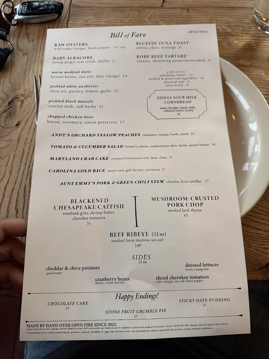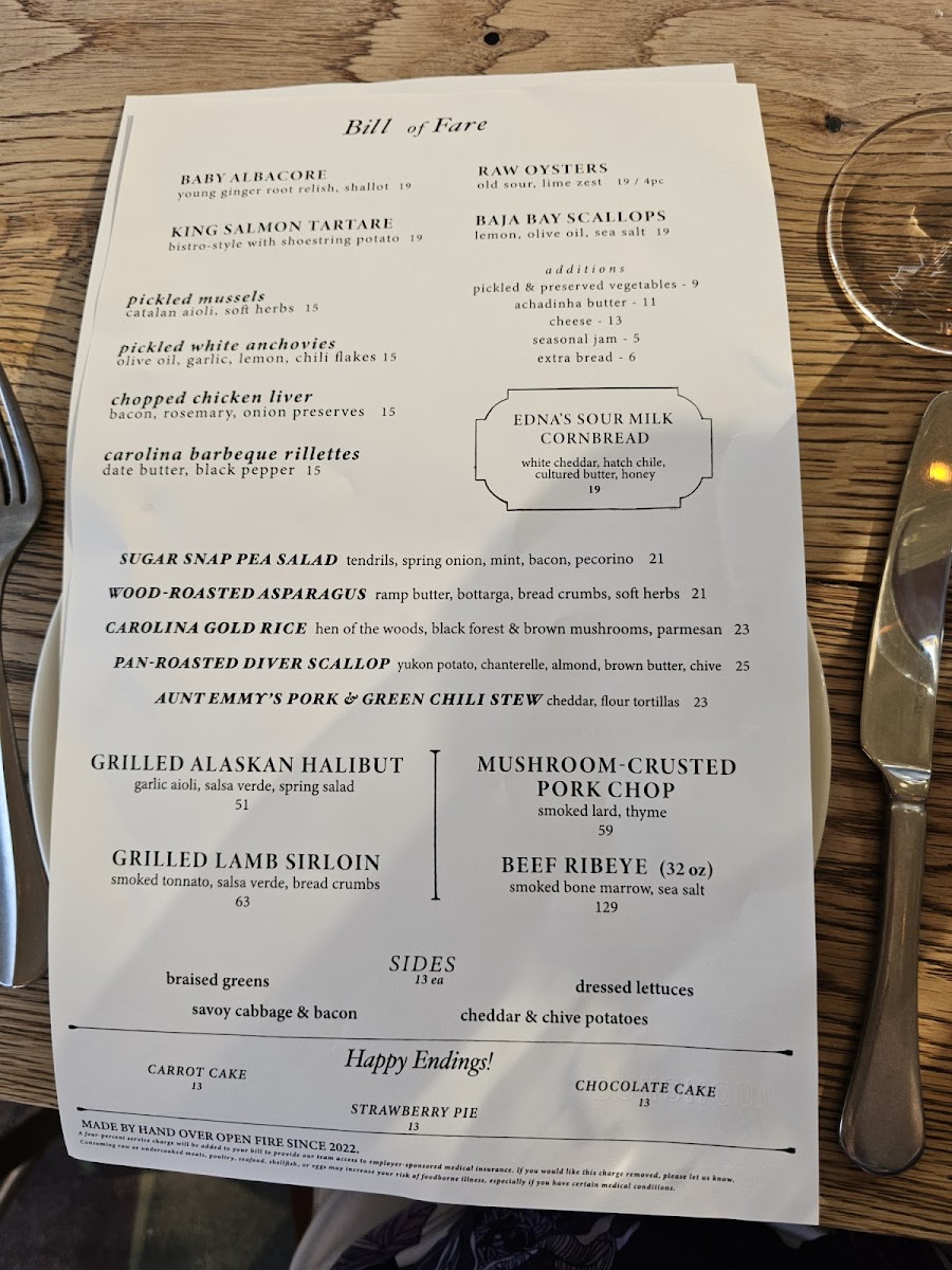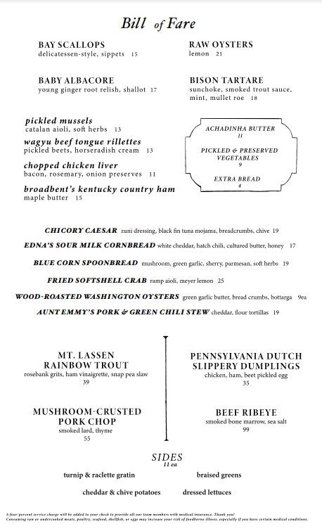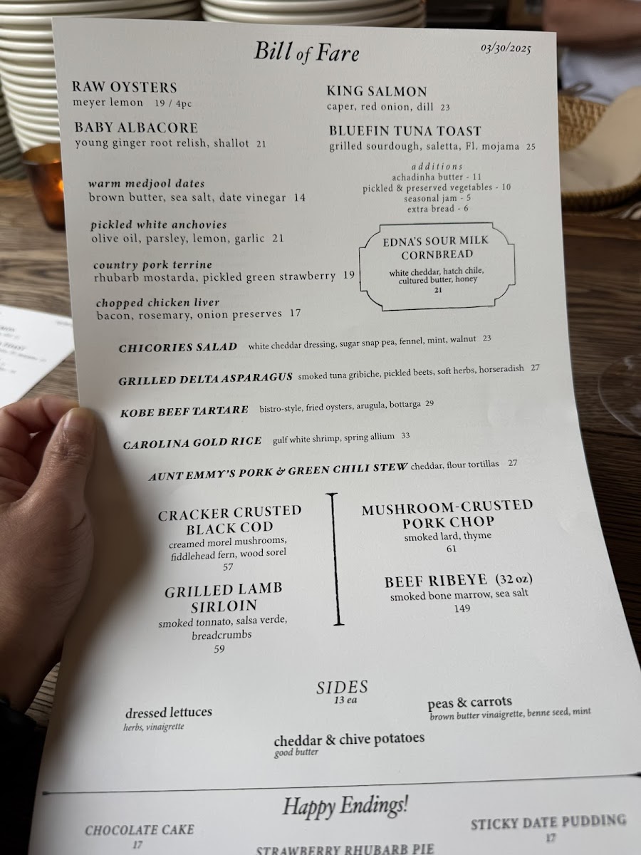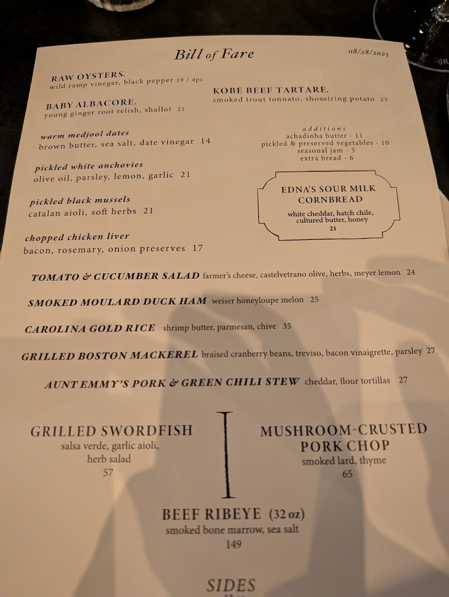 Dunsmoor excels in crafting dishes that marry fresh ingredients with bold flavors. The menu, dubbed the "Bill of Fare," is a testament to culinary artistry, showcasing standout offerings such as the Raw Oysters with old sour and lime, a delectable way to kick off your meal for just $19. The King Salmon Belly served with horseradish cream, smoked roe, and dill is a vibrant dish that dances on your palate for $21. For a more unique option, do not miss the Kobe Beef Tartare, where the richness is beautifully complemented by smoked tonnato and crispy shoestring potatoes, all for $19.